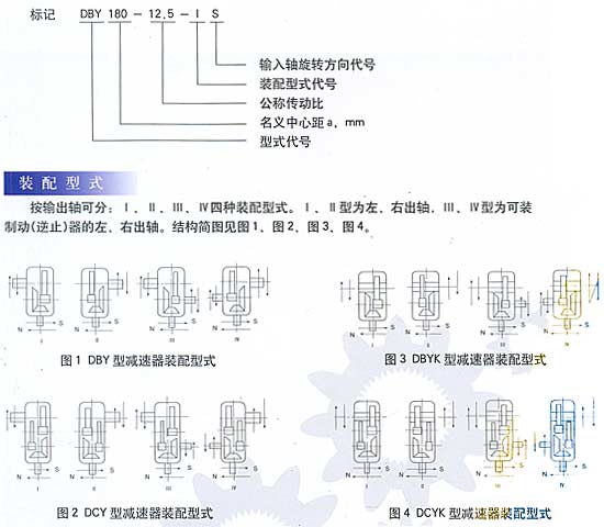 減速器的型號(hào)由型式代號(hào),名義中心距a(末級(jí)中心距),公稱(chēng)傳動(dòng)比,裝配型式代號(hào),輸入軸旋轉(zhuǎn)方向代號(hào)組成。