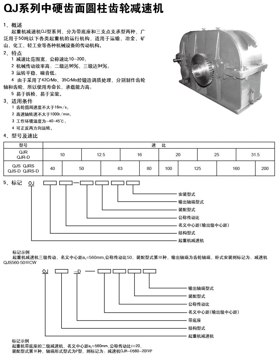 超重機(jī)減速機(jī)QJ型系列,分為帶底座和三支點(diǎn)支承型兩種,廣泛用于50噸以下各類(lèi)超重機(jī)的運(yùn)行機(jī)構(gòu),適用于運(yùn)輸、冶金、礦山、化工、輕工業(yè)等各種機(jī)械設(shè)備的傳動(dòng)機(jī)構(gòu)。